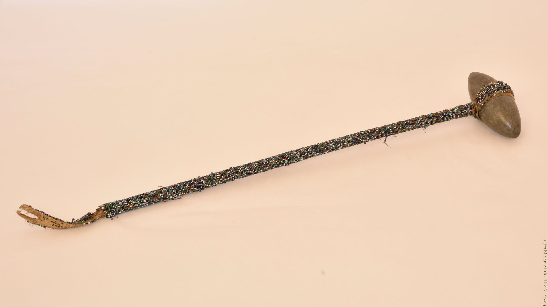 Das folgende Beispiel zeigt eine solche, aufwendig mit Glasperlen verzierte Steinhammerkeule der Sioux, Abb. 1. Der einstigen Funktion als Waffe enthoben, sollte sie ihrem neuen Besitzer als Andenken dienen. Sie ist aus einem ovoid geschliffenen Stein mit teilweise belassener kristalliner Struktur gearbeitet, was sie besonders macht. Der dünne, hölzerne Stiel ist in die zentrierte Bohrung der steinernen Ellipse eingelassen, in Wildleder statt Rohhaut eingenäht und scheinbar zufällig mit bunten kleinen Glasperlen, die auf Sehne aufgefädelt sind, abgewickelt. Diese charakteristische Verzierung bezeichnen Ethnologen als Harlekin, da das Muster an ein typisches Clownskostüm erinnert, das sich bunt und unruhig über einen weißen Grund erstreckt.